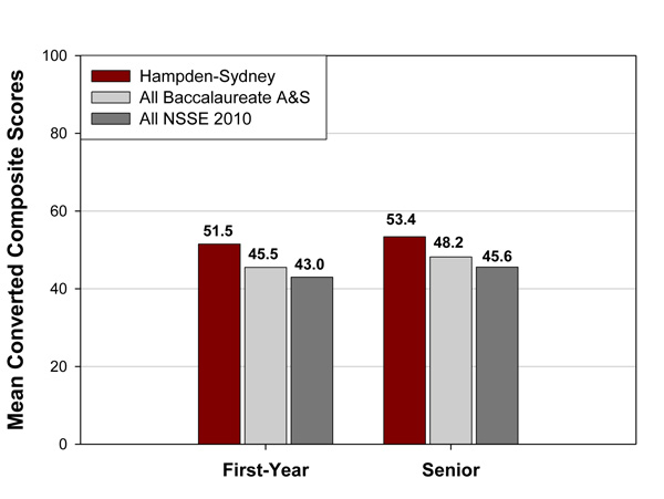 Summary: In the measures of reading and writing, Hampden-Sydney students rate more highly the amount of reading and writing they do than students from other baccalaureate-granting arts and sciences schools and considerably more than students from the entire population of NSSE respondent schools. Moreover, this occurs in both the first year and in the senior year, where the same pattern is found.